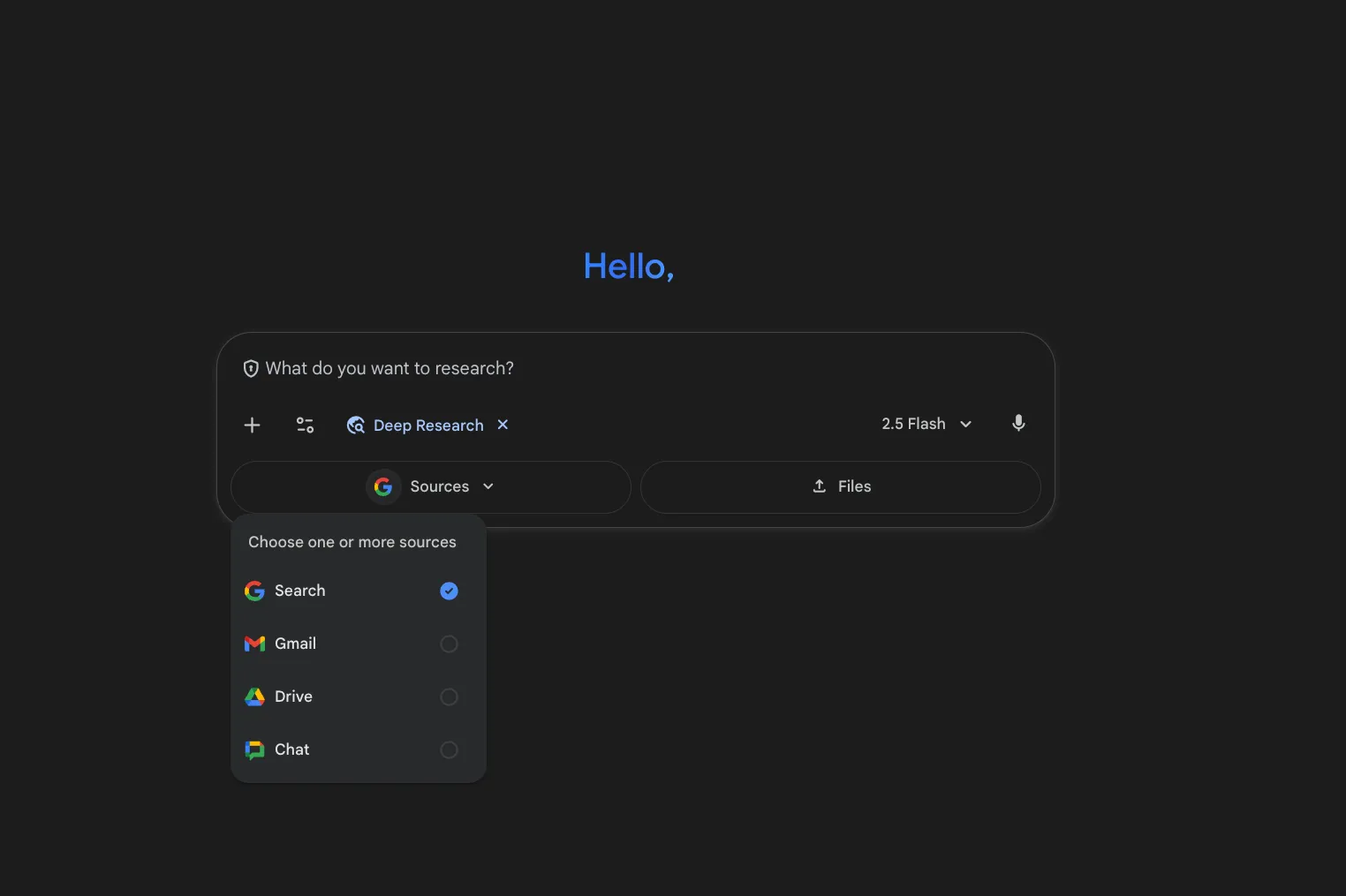 در رابط کاربری جدید Gemini، زمانی که کاربر گزینه «deep research» را از نوار دستور انتخاب می‌کند، چهار منبع داده Google Search، Gmail، Drive و Chat برای جست‌وجو در دسترس قرار می‌گیرد. کاربران می‌توانند تعیین کنند که کدام‌یک از این منابع به مدل دسترسی داشته باشد. در نتیجه، ایمیل‌ها، فایل‌های Docs، Sheets، Slides، اسناد PDF و حتی گفت‌وگوهای کاری می‌توانند به‌ عنوان داده‌های زمینه‌ای برای شکل‌گیری پاسخ‌ها به کار گرفته شوند.