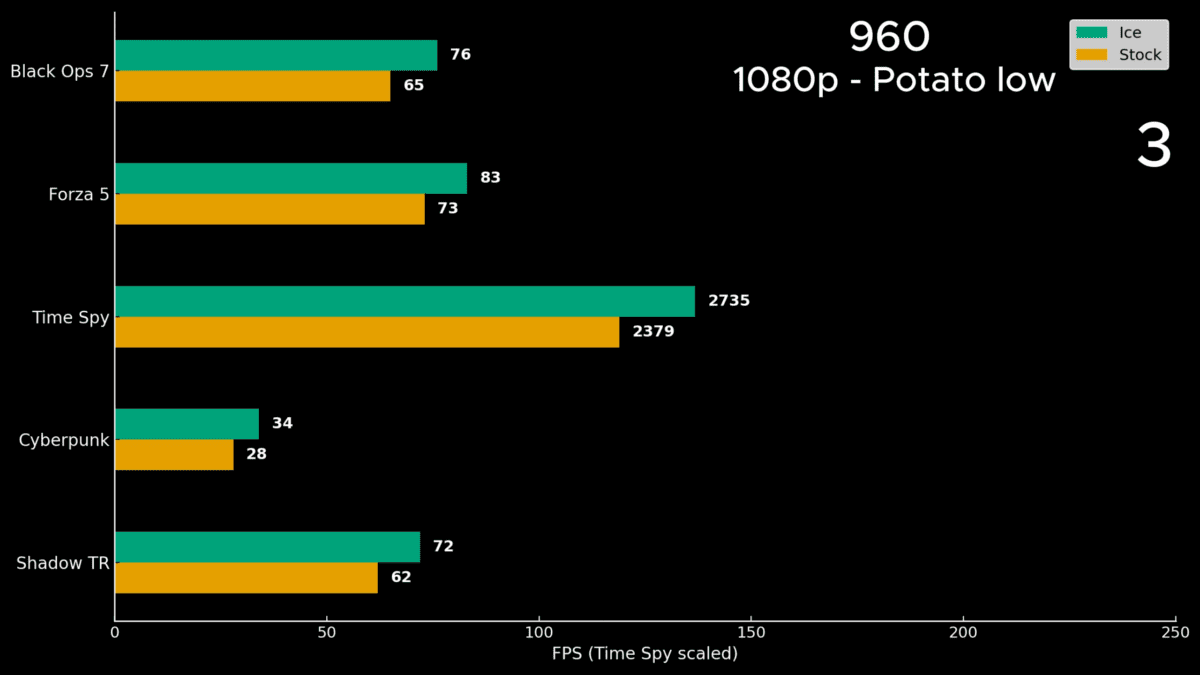 مرحله دوم آزمایش روی GTX 960 نتایج شگفتانگیزتری به همراه داشت. این کارت که در معماری قدیمیتر عمل میکند، با خنکسازی زیر صفر توانست جهشی چشمگیر ثبت کند. در بازی Cyberpunk 2077 حدود ۲۱ درصد افزایش نرخ فریم مشاهده شد و در Black Ops 7 نیز میزان فرکانس بوست ۲۲۰ مگاهرتز بیشتر از مقدار معمول اندازهگیری شد. میانگین بهبود عملکرد این کارت در تمام آزمونها حدود ۱۷ درصد گزارش شد.