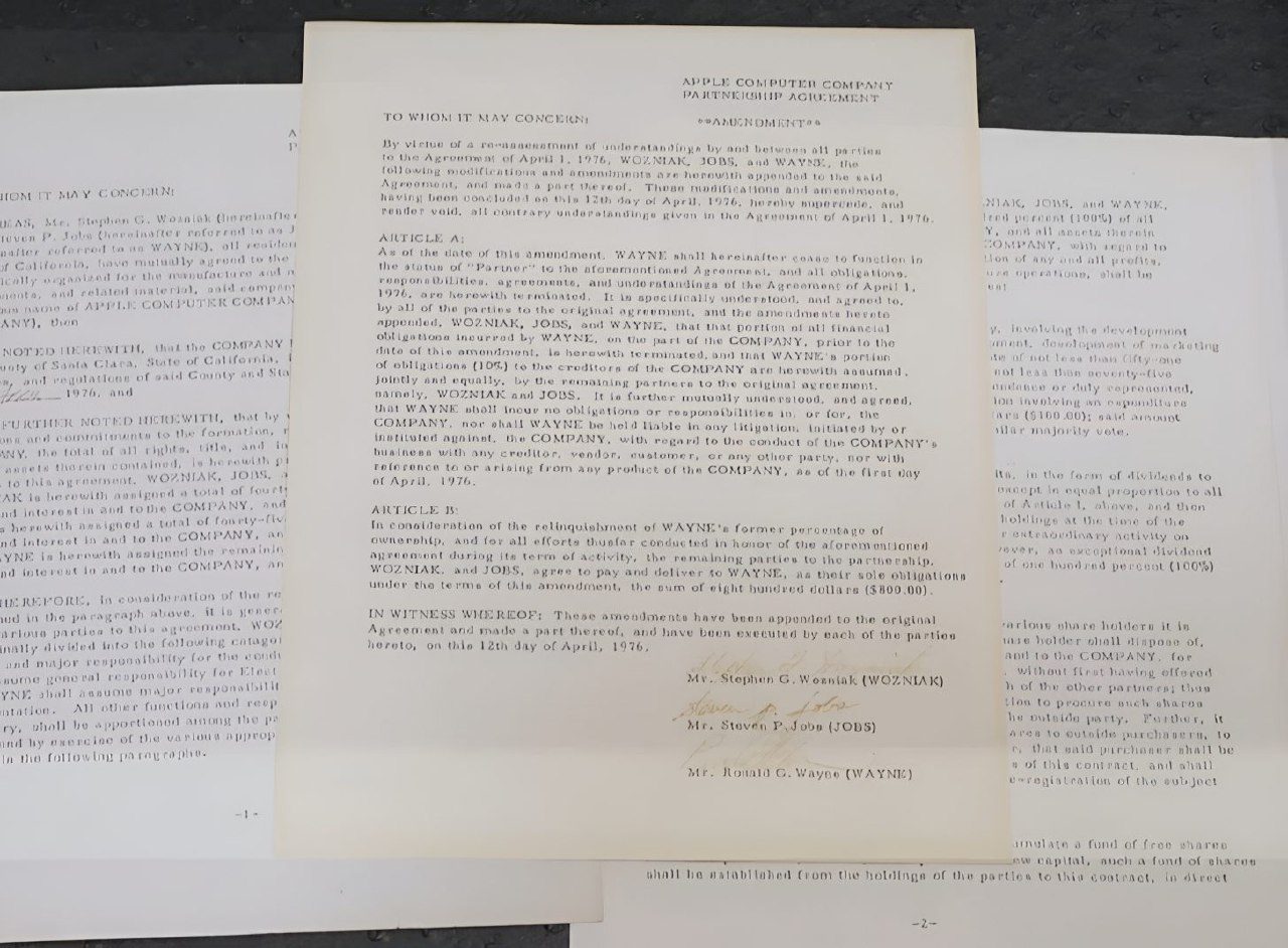 سند "Apple Computer Company Partnership Agreement" که در تاریخ ۱ آوریل ۱۹۷۶ امضا شده و نام‌های استیو وزنیاک (Wozniak)، استیو جابز (Jobs) و رونالد وین (Wayne) در انتهای آن دیده می‌شود.
