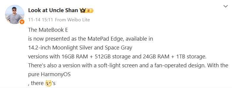 در ادامه گزارش‌ها، افشاگر دیگری با نام UncleShan تأکید کرده است که MatePad Edge 14.2 هواوی در واقع نسخه ارتقایافته MateBook E در قالب یک تبلت 2در1 است و از طراحی دو فن بهره می‌برد. به گفته او، این محصول میان اکوسیستم تبلت و رایانه‌های شخصی پل می‌زند و در رده قیمتی بالا قرار خواهد گرفت.