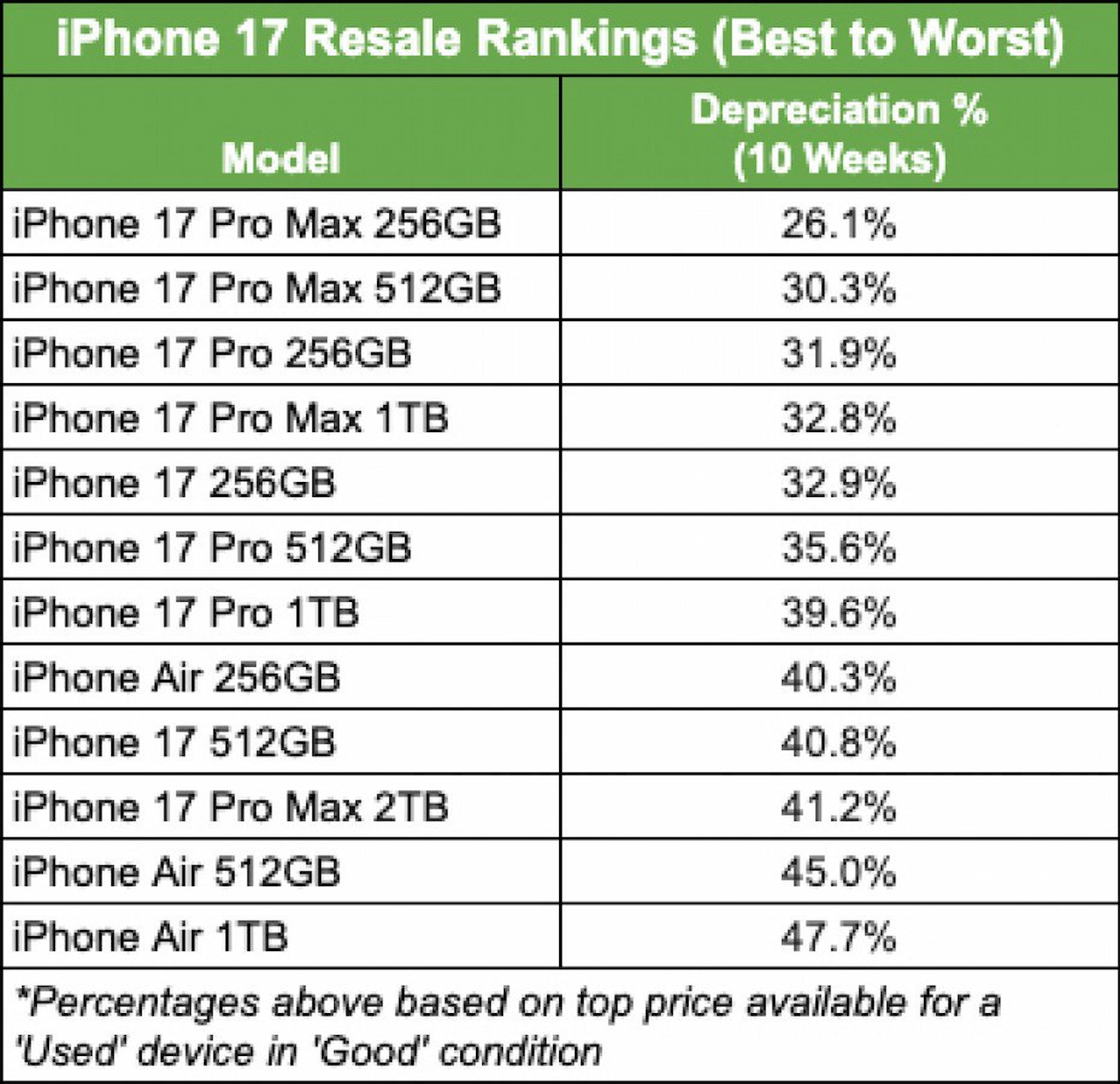 مدل 256 گیگابایتیآیفون 17 پرو مکس بهترین عملکرد را داشته و تنها 26.1٪ از ارزش اولیه خود را از دست داده است. آیفون 17 پرو با 256 گیگابایت حافظه نیز 32٪ از ارزش خود را از دست داده است، در حالی که آیفون 17 مدل پایه 256 گیگابایتی کاهش 33٪ را تجربه کرده است.