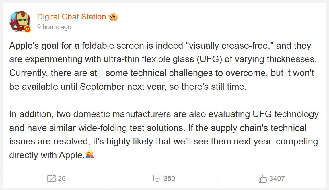 دیجیتال چت استیشن، افشاگر شناختهشده، پساز ارائه جزئیاتی درباره نمونه اولیه آیفون فولد فاقد فیس آیدی، اما مجهز به حسگر تاچ آیدی جانبی، اکنون ادعا میکند که مشکلات کنونی اپل دستاورد بزرگ این شرکت در دستیابی به طراحی بدون چینخوردگی را تحتالشعاع قرار داده است. کوپرتینوییها برای دورزدن این مانع ظاهراً حلنشدنی، انواع مختلف UFG را با ضخامتهای متفاوت آزمایش میکنند.