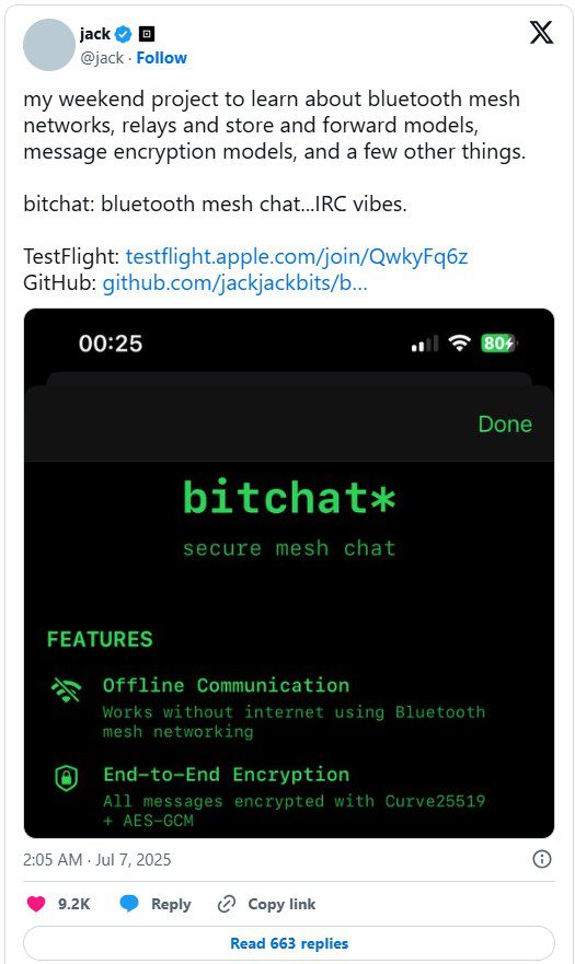 جک دورسی، بنیان‌گذار توییتر، آزمایش عمومی نسخه بتای اپلیکیشن جدید خود به نام بیت‌چت (Bitchat) را آغاز کرده است؛ پیام‌رسانی همتا‌به‌همتا که بدون نیاز به اینترنت و از طریق بلوتوث کم‌مصرف (Bluetooth Low Energy) کار می‌کند.