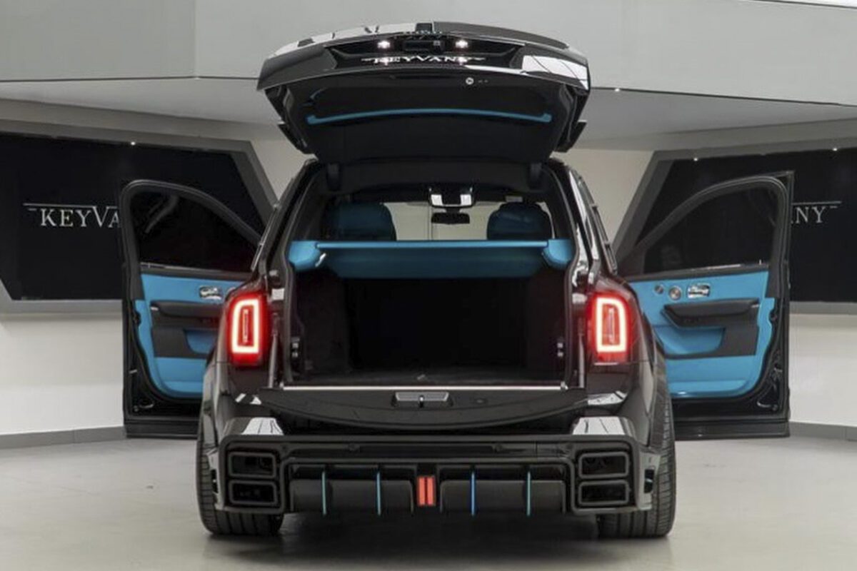 اگر به داخل کابین نگاهی بیندازیم، شگفتیها بیشتر نمایان میشود. فضای داخلی با چرم آبی روشن به طور کامل پوشانده شده است؛ از صندلیها گرفته تا رودریها، داشبورد، غربیلک فرمان و حتی بخشهای کوچکتر، همگی با این رنگ خاص، جلوهای متفاوت یافتهاند. کفپوشهای جدید، تزئینات ویژه داخلی و تریمهای رنگی منحصربهفرد، فضایی لوکس و در عین حال خاص ایجاد کردهاند که بهسختی میتوان مشابه آن را در دیگر شاسیبلندهای لوکس یافت. ترکیب این رنگآمیزی جسورانه با ظرافتهای طراحی کیوانی، هیولای ۲ را به مدلی متمایز در میان دیگر خودروهای تیونینگشده تبدیل کرده است.