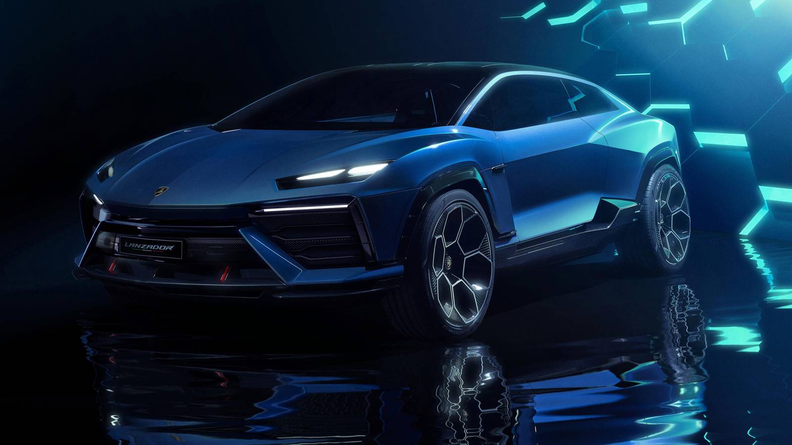 نمای سه‌چهارم جلو از کانسپت لامبورگینی لانزادور با نورپردازی نئونی آبی در پس‌زمینه تاریک