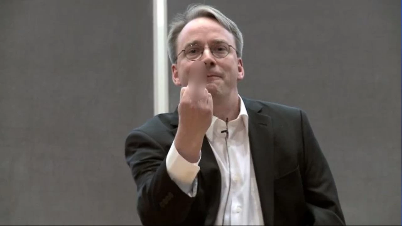 لینوس توروالدز در حال نشان دادن انگشت وسط (یک ژست اعتراضی) در جریان یک سخنرانی عمومی.