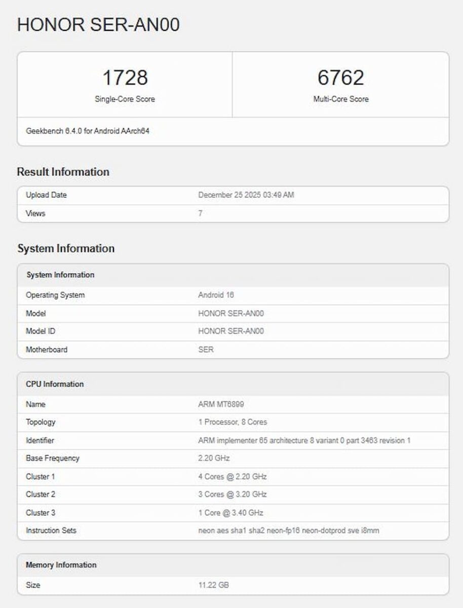 در این پایگاه داده، دستگاه آزمایش‌شده با شناسه فنی Honor SER-AN00 ثبت شده است که کارشناسان آن را متعلق به گوشی آنر پاور ۲ می‌دانند. این محصول که قرار است جانشین مدل محبوب آنر پاور شود، به‌عنوان یکی از اولین میزبانان تراشه دیمنسیتی ۸۵۰۰ شناخته می‌شود. طبق داده‌های ثبت‌شده، این دستگاه از ۱۲ گیگابایت رم بهره می‌برد.