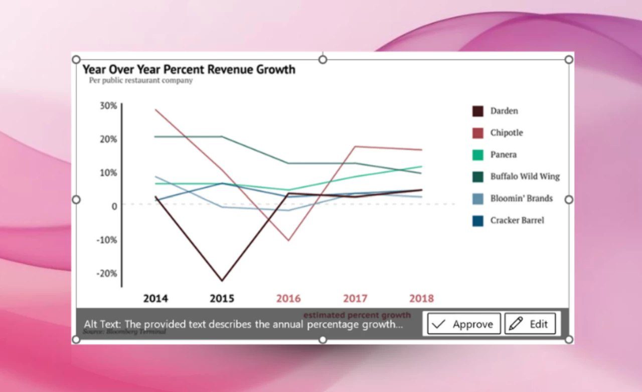 به گزارش سرویس هوش مصنوعی تکناک، تیم دسترسیپذیری مایکروسافت آفیس قابلیت هوشمند جدیدی برای تولید خودکار متن جایگزین (Alt Text) در اسناد ورد و پاورپوینت معرفی کرد. این ویژگی قدرت پردازش عصبی را در کامپیوترهای نسل جدید برای کمک به کاربران توانخواه به کار میگیرد.