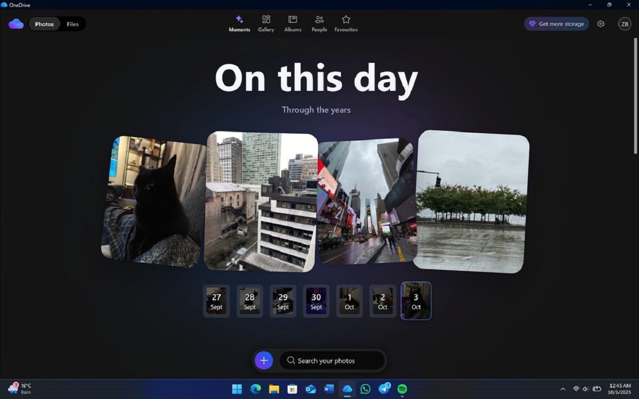 در حالت گالری، نوار بالایی شامل دکمههایی برای دسترسی به بخشهای Moments، Albums، People و Favorites است. قابلیت Moments مشابه اپ موبایلی OneDrive عمل میکند و تصاویر ثبتشده در همین روز در سالهای گذشته را به شکلی چشمنواز نمایش میدهد.