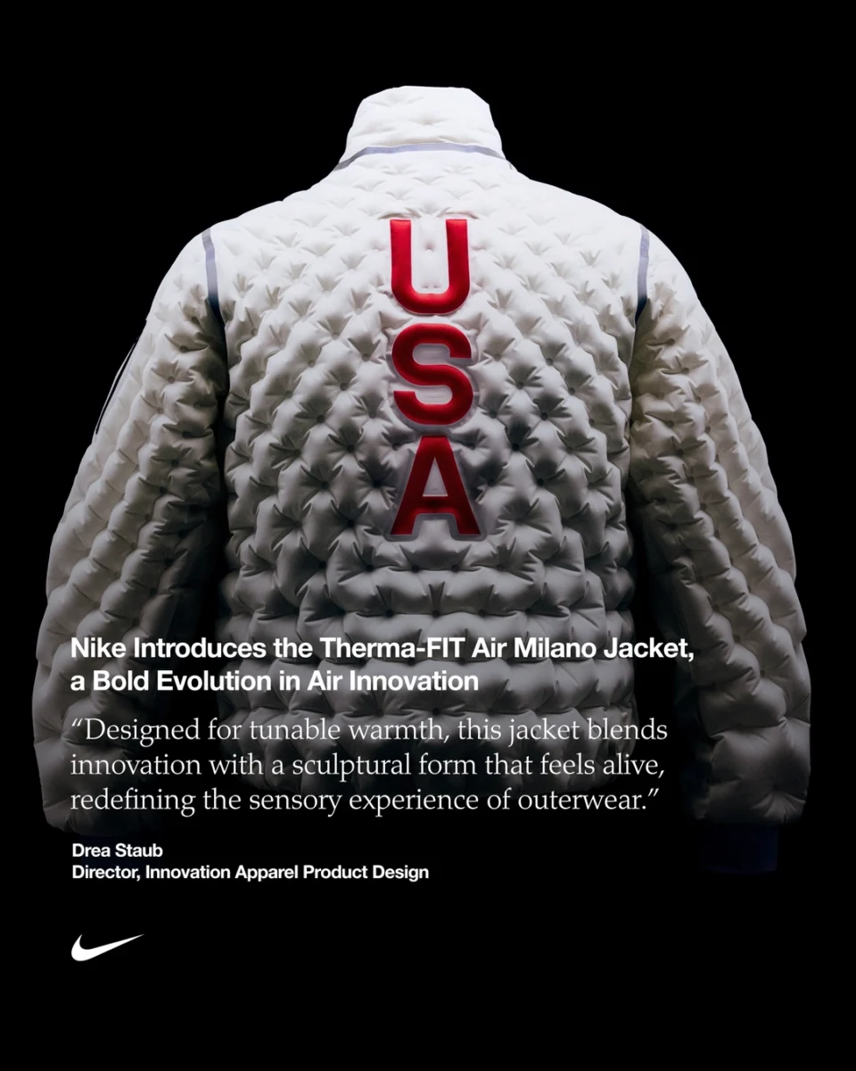 شرکت نایکی اعلام کرده است که اعضای Team USA برای نخستینبار در زمستان امسال و در جریان مراسم مدال در شهر میلان، از ژاکت جدید Air Milano به عنوان لباس رسمی خود استفاده خواهند کرد. نسخه اختصاصی تیم آمریکا دارای طراحی مجسمهوار، پمپ اختصاصی ACG، برندینگ فلزی براق و آستر داخلی با نقش “Garden of the Gods” است، که تصویری الهامگرفته از مقر تمرینی تیم در Colorado Springs میباشد. علاوه بر این، زیپ مغناطیسی و حلقههای داخلی مخصوص دست برای کمک به ورزشکاران پارالمپیکی در طراحی آن لحاظ شده است.