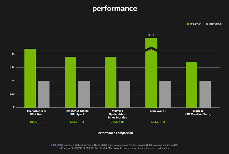 همچنین، انویدیا برخی از معیارهای عملکرد کارت را بهاشتراک گذاشته و آن را با RTX 3090 Ti مقایسه کرده است. RTX 4090 D با استفاده از DLSS+RT در بازیهایی مانند Alan Wake 2، تا 3.5 برابر عملکرد بهتری را ارائه میدهد.