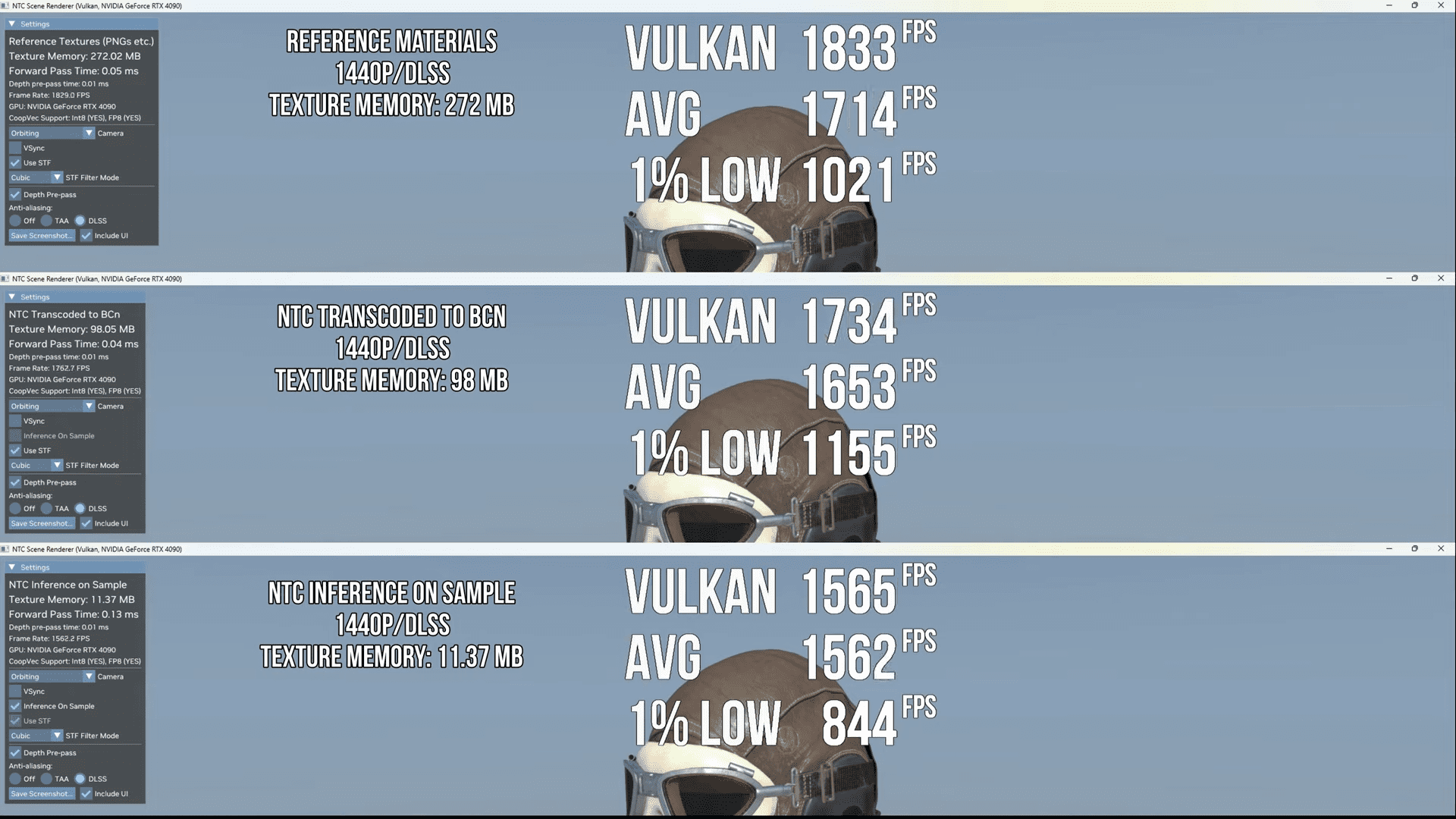 در رزولوشن ۱۴۴۰p و با فعال بودن DLSS upscaling، حالت “NTC transcoded to BCn” مصرف حجم حافظه گرافیکی مورد نیاز بافتها را ۶۴ درصد کاهش داد و از ۲۷۲ مگابایت به ۹۸ مگابایت رساند. اما حالت “NTC inference on sample” این مقدار را به ۱۱.۳۷ مگابایت کاهش داد، که نشاندهنده ۹۵.۸ درصد کاهش مصرف حافظه در مقایسه با روشهای سنتی فشردهسازی و ۸۸ درصد کاهش در مقایسه با نسخه قبلی فشردهسازی عصبی است.