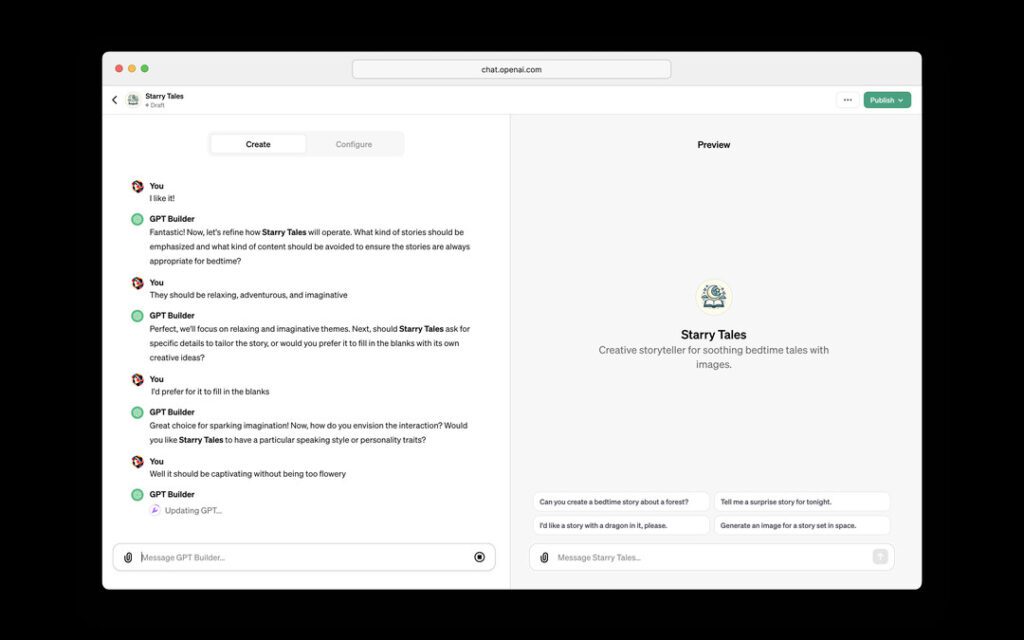رابط کاربری OpenAI به شما امکان میدهد تعیین کنید که یک GPT چگونه باید قبل از انتشار با افراد تعامل داشته باشد. چت بات “راهنمای رویداد” در مراسم DevDay ، دستور داشت تا مفید و مختصر باشد و از تداخل در زمانبندیها اجتناب کند. OpenAI چندین پرسش برای آغاز مکالمه به صورت خودکار تولید کرده است، مانند “اولین جلسه امروز چیست؟”