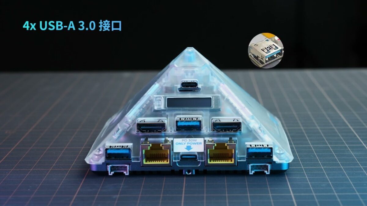 دستگاه هرمی‌شکل MSSTACK با بدنه شفاف و نورپردازی داخلی، مجهز به ۴ پورت USB‑A 3.0، دو پورت Ethernet، خروجی‌های HDMI و درگاه USB‑C با توان PD 30W (Only Power)، مناسب کاربردهای Edge AI، سرور خانگی و هاب توسعه.