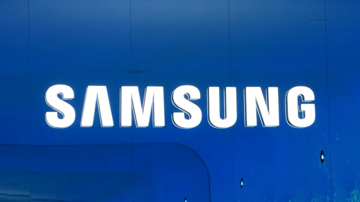 لوگوی درخشان و سفید سامسونگ روی پس‌زمینه‌ای به رنگ آبی روشن