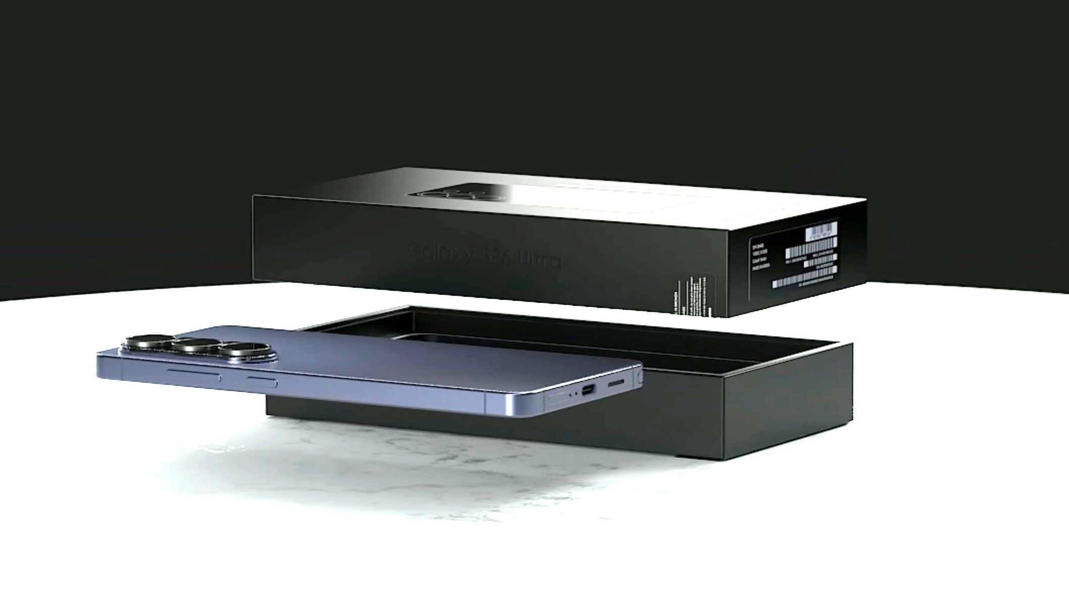 یک گوشی هوشمند باریک به رنگ بنفش یاسی که در کنار جعبه مشکی رنگ خود (با نوشته Galaxy S26 Ultra) قرار دارد.