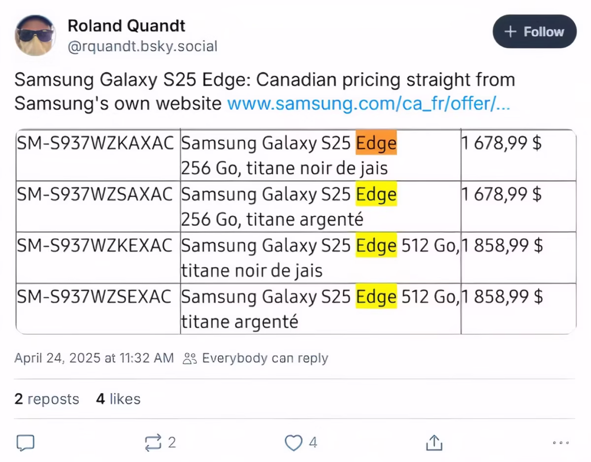 سامسونگ بهصورت ناخواسته قیمت گوشی گلکسی S25 اج را پیشاز رونمایی رسمی، در وبسایت کانادا خود منتشر کرده است.