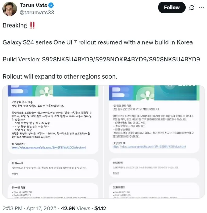 با‌این‌حال، کاربران نباید انتظار داشته باشند این نسخه به‌زودی در مناطق دیگر منتشر شود؛ چراکه شرکت‌ها معمولاً از انتشار نسخه‌های جدید در روزهای جمعه خودداری می‌کنند؛ چون جمع‌آوری بازخورد و بررسی باگ‌ها در پایان هفته کاری دشوارتر می‌شود. افزون‌بر این، با درنظرگرفتن سابقه پرایراد این نسخه، سامسونگ احتمالاً با احتیاط بیشتری عمل خواهد کرد.