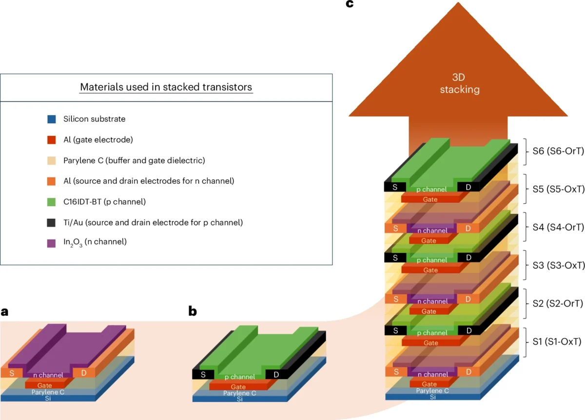 هر لایه از این تراشه شامل ترانزیستورهای بسیار کوچک است که سیگنالهای الکتریکی را مدیریت میکنند. بخشی از این ترانزیستورها از مواد معدنی مانند اکسید ایندیوم (n-type indium oxide) ساخته شدهاند و بخش دیگر از ترکیبات آلی تشکیل شده است. ترکیب این دو نوع ماده، ساختاری موسوم به معماری «ترکیبی CMOS» را شکل میدهد که در قلب بیشتر دستگاههای الکترونیکی امروزی قرار دارد.