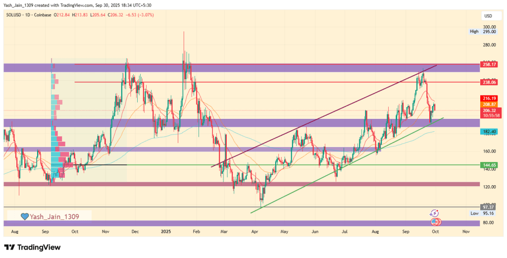 از منظر تکنیکال، سولانا در کف کانال صعودی خود و درست زیر سطح ۲۰۰ دلار حمایت شده است. خریداران بارها این منطقه را حفظ کردهاند و در صورت تداوم قدرت، جهش تا محدوده ۲۳۰ تا ۲۵۵ دلار قابل انتظار است. اگر مومنتوم صعودی ادامه یابد، مقاومت بعدی در بازه ۳۳۰ تا ۳۵۰ دلار قرار خواهد داشت که میتواند مرز بالقوه برای یک شکست صعودی بزرگ باشد.