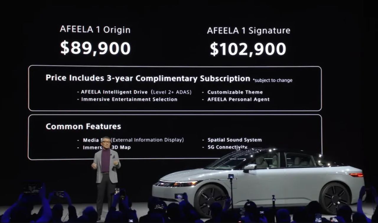 کنایچیرو یوشیدا، مدیرعامل سونی روز دوشنبه در نمایشگاه CES 2025 اعلام کرد که قیمت ابتدایی خودروی چهار درب Afeela حدود ۸۹,۹۰۰ دلار خواهد بود. همچنین نسخهای با ویژگیهای متنوعتر و قیمت بیشتر، با قیمت ۱۰۲,۹۰۰ دلار نیز در دسترس خواهد بود.