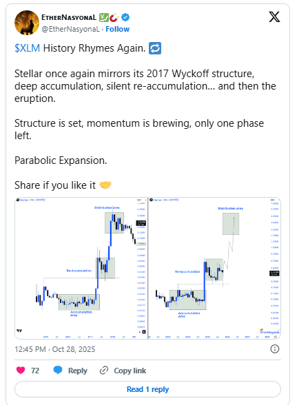 بر اساس دادههای اخیر منتشرشده در شبکه اجتماعی ایکس، نمودار قیمتی استلار بار دیگر شباهت زیادی به فاز انباشت ویکاف در سال ۲۰۱۷ دارد؛ مرحلهای که طی آن انباشت آرام و بیسروصدا رخ داد و پس از آن، جهشی انفجاری قیمت را رقم زد. رفتار قیمتی کنونی نیز بیانگر آن است که سرمایهگذاران بزرگ در حال جذب آرام عرضه موجود هستند و همین امر نوسانات را در بازهای محدود نگه داشته است.