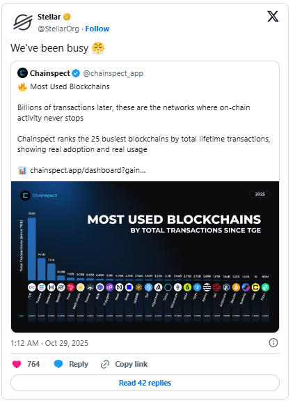 طبق دادههای پلتفرم چیناسپکت (Chainspect)، حضور مداوم استلار در میان ۲۵ بلاکچین پرتراکنش جهان بیانگر آن است که استفاده از این شبکه فراتر از معاملات سفتهبازانه بوده و به کاربردهای واقعی در دنیای پرداخت منتهی شده است.