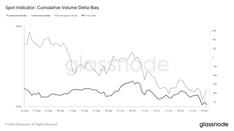 با وجود جهشهای مقطعی قیمت، احساسات کوتاهمدت در میان معاملهگران بیتکوین همچنان منفی است. دادهها نشان میدهد که شاخص «تغییر تجمعی حجم معاملات نقدی» (Spot CVD) در بیشتر صرافیهای بزرگ روند نزولی دارد؛ موضوعی که بیانگر فشار مداوم فروش و کاهش خریدهای تهاجمی است. به عبارت دیگر، معاملهگران بیشتری در حال فروش در موجهای صعودیاند تا خرید در کفهای قیمتی.