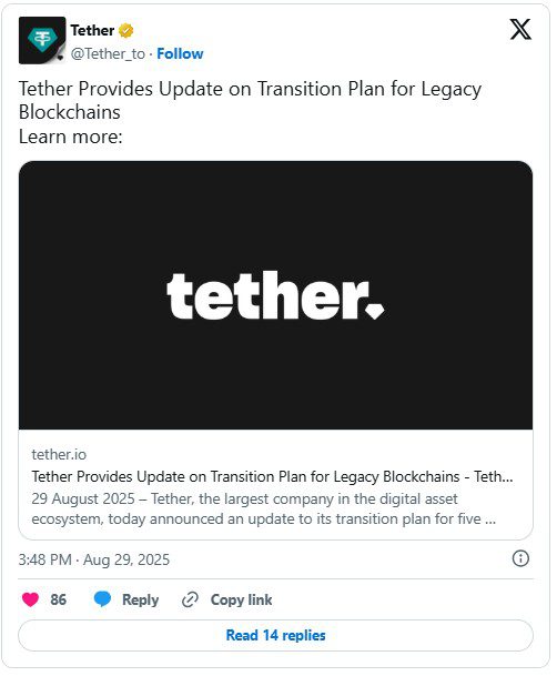 شرکت تتر (Tether)، صادرکننده استیبلکوین یواسدیتی (USDT)، تصمیم پیشین خود مبنی بر مسدود کردن تراکنشها روی پنج بلاکچین تا سپتامبر ۲۰۲۵ را لغو کرد.