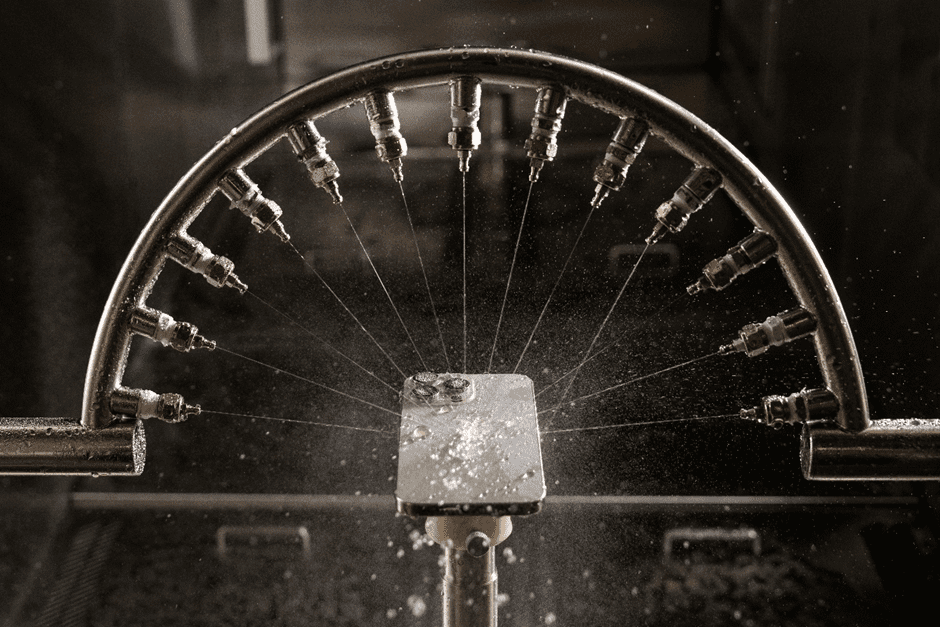 آزمایشهای مقاومت در برابر مایعات در آزمایشگاه دوام اپل، از سادهترین قطرهچکانیها تا فشارهای شدید آب در عمق شبیهسازیشده، در محفظهای به نام IPX Chamber انجام میشود. محصولاتی که از این آزمونها با موفقیت عبور کنند، گواهینامههای IPX5 تا IPX8 را دریافت میکنند. این آزمونها نهتنها شامل آب، بلکه شامل مایعاتی همچون عطر، کرم ضدآفتاب، نوشابه و آبمیوه نیز میشوند تا شرایط زندگی روزمره را کاملاً بازسازی کنند.