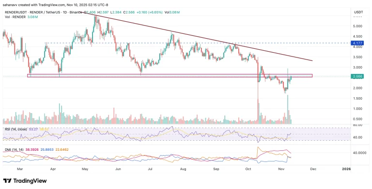 پس از جهش اخیر، قیمت رندر وارد محدودهای حیاتی شده که پیشتر بهعنوان ناحیه حمایتی قوی عمل میکرد. شاخص RSI روندی افزایشی دارد و شاخص DMI نیز بهتازگی با تقاطع صعودی همراه شده است. بنابراین انتظار میرود قیمت بتواند مقاومت ۲.۵ تا ۲.۶ دلار را پشت سر گذاشته و تا سطح ۳ دلار پیش رود. عبور از خط روند نزولی نیز میتواند زمینهساز صعودی تا محدوده ۴ دلار شود.