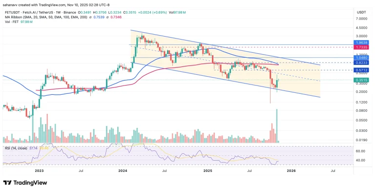 قیمت FET در حدود ۱.۹۵ دلار معامله میشود و از ابتدای نوامبر تاکنون ۹ درصد رشد کرده است. افزایش استقرار عاملهای خودکار و رشد کاربری شبکه، باعث انباشت تدریجی و افزایش نسبت سهامگذاری شده است. با این حال، نمودار هفتگی نشان میدهد که قیمت همچنان در کانالی نزولی حرکت میکند. RSI پس از لمس کف، نشانههایی از بازگشت دارد اما میانگینهای متحرک ۵۰ و ۲۰۰ روزه در آستانه تشکیل تقاطع نزولی (Death Cross) هستند. علاوه بر این، شاخص جریان پول (CMF) هنوز نتوانسته بالاتر از صفر قرار گیرد و این میتواند نشانهای از تداوم روند نزولی باشد.