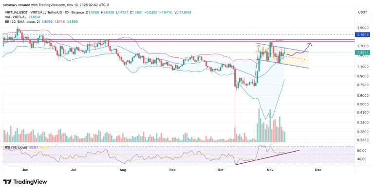 نمودار قیمت ویرچوئال پروتکل نشان میدهد که توکن در حال حرکت در الگوی پرچم صعودی است، که نوعی تثبیت سالم پیش از ادامه روند محسوب میشود. RSI در حال نزدیک شدن به باند بالایی است و قدرت خرید را نشان میدهد، در حالیکه فشردگی باندهای بولینگر از احتمال افزایش نوسانات در آینده نزدیک حکایت دارد. در صورت عبور قیمت از مقاومت کلیدی ۱.۵ دلار، احتمال تداوم رشد تا سطح ۱.۸ دلار بسیار زیاد است.