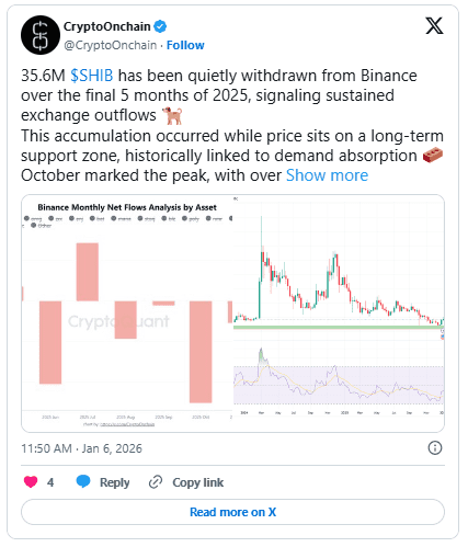 شیبا اینو سال ۲۰۲۶ را با رویکردی صعودی آغاز کرده است. پس از یک دوره طولانی افت قیمت، شکست کانال نزولی مشاهده شد و نشانههای مشخصی از ورود به فاز انباشت شکل گرفت. سرمایهگذاران بزرگ بهتدریج در حال جمعآوری این رمزارز هستند و بر اساس گزارشی که اخیراً در شبکه ایکس منتشر شده، طی ماههای گذشته بیش از ۳۵٫۶ میلیون واحد SHIB بهصورت آرام از بازار خارج شده که نشانهای از بازگشت تقاضا محسوب میشود.