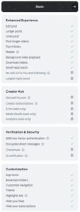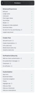 در این اشتراک، نشان اعتبارسنجی تأییدشده (Verified) وجود ندارد و خالقان نمیتوانند پولی را برای پستهای خود دریافت کنند؛ اما بسیاری از امکانات مفید را با هزینهای معقول و مقرونبهصرفه فعال میکند. درحالحاضر، هر دو اشتراک شبکه اجتماعی ایکس ازطریق وب دردسترس هستند.