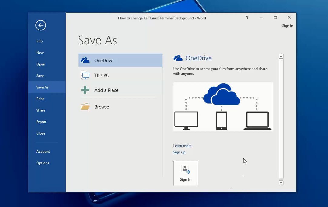همچنین در زمان ذخیره با میانبر Ctrl+S، پیامی با مضمون «این فایل در فضای ابری ایجاد شده است» در بالای پنجره ذخیره نمایش داده میشود. در صورت بستن فایل بدون ذخیره، ورد از کاربر تأیید میگیرد که آیا قصد ذخیره دارد یا خیر؛ اما فایل خالی بدون درخواست تأیید حذف خواهد شد.