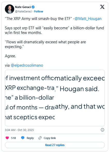 به باور مککلارگ، تقاضا برای ETF ریپل بسیار بالا خواهد بود و انتظار میرود بین ۵ تا ۱۰ میلیارد دلار سرمایه در ماه نخست وارد این صندوقها شود. مت هوگان، مدیر سرمایهگذاری بیتوایز، نیز پیشبینی مشابهی دارد و میگوید «ارتش ریپل» بهسرعت اقدام به خرید ETF خواهد کرد. اریک بالچوناس از بلومبرگ نیز این رقابت میان ناشران ETF را به «دوی ماراتن سرمایهگذاری» تشبیه کرد که در آن هر شرکت برای جلب توجه سرمایهگذاران با سرعت بیشتری حرکت میکند.
