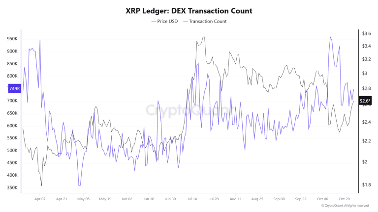 دادههای درونزنجیرهای از صرافی غیرمتمرکز دفترکل ریپل (XRP Ledger DEX) نشانههای صعودی آشکاری را نمایش میدهد. از ماه مه ۲۰۲۵ تاکنون، با وجود تثبیت قیمت، تعداد تراکنشهای DEX بهطور پیوسته افزایش یافته است؛ این موضوع نشاندهنده افزایش سفارشگذاری و رشد نقدینگی در پشتصحنه است. چنین الگوهایی معمولاً پیش از حرکات قیمتی بزرگ ظاهر میشوند و نشان میدهند که بازار در حال آماده شدن برای جهشی قدرتمند است.