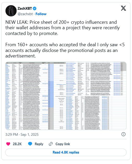 زک‌ایکس‌بی‌تی روز دوشنبه در پستی در شبکه اجتماعی X یک فایل اکسل منتشر کرد که شامل نام بیش از ۲۰۰ اینفلوئنسر رمزارزی بود که اخیراً از سوی یک پروژه برای تبلیغ توکن‌ها پیشنهاد همکاری دریافت کرده بودند.